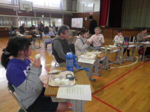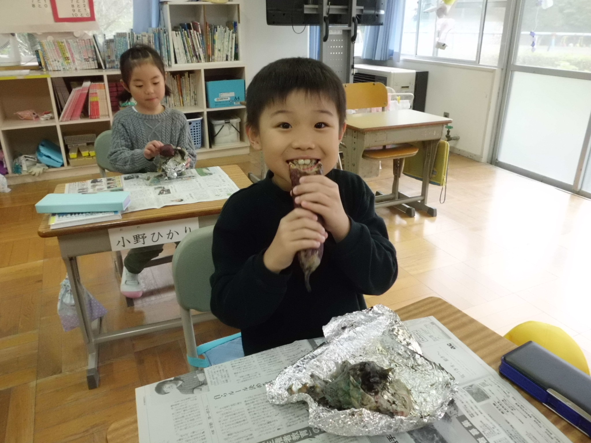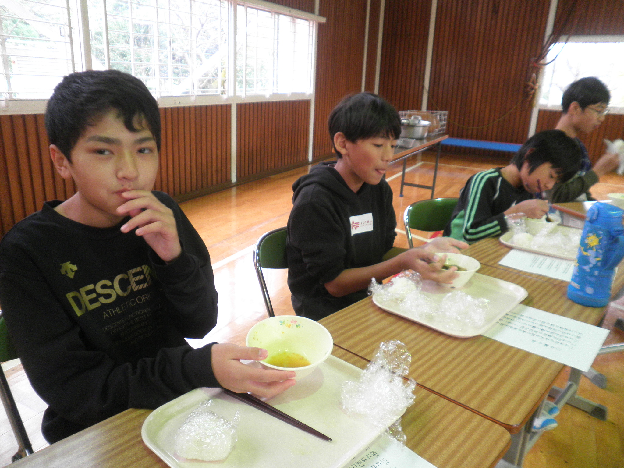 11月15日は3rd Missionの自給自足DAYでした。スローガンは「自然のめぐみでつながりをつくる 丹那食堂の おいしい料理」です。この日のために栽培・収穫した野菜を使って、子供たちは「具だくさん味噌汁」「おにぎり」「焼き芋」を作りました。5・6年生が作った味噌汁は、しいたけでとった出汁が効いていて本当においしかったです。因みに味噌も手作りです。おにぎりは、5年生が地域の方の田んぼをお借りして作ったお米を炊いたものです。塩気がマイルドでお味噌汁とよくあいました。焼き芋は、子供たちが新聞紙とアルミホイルに包み、焼き芋ボランティアの方が時間をかけて焼いてくださいました。5時間目に、甘くてほくほくの焼き芋を頬張りながら、子供たちは振り返りを行いました。
