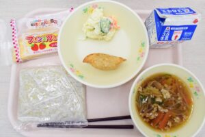 黒糖入り食パン、秋味シチュー、ツナサラダ、りんごゼリー、牛乳 秋味シチューのさつまいもは丹那小で収穫したものです。 給食 10月20日の給食【ふるさと給食の日】 11月5日の給食【1年生リクエスト給食】 関連記事 2月24日の給食【幼稚園リクエスト給食】 2026年2月24日 1月28日~30日の給食 2026年1月30日 1月27日の給食 2026年1月27日 1月22日の給食【English Day】 2026年1月22日 1月7日の給食【お正月メニュー】 2026年1月7日 12月22日の給食【冬至給食】 2025年12月22日 12月19日の給食【ブックメニュー】 2025年12月19日 12月18日の給食 2025年12月18日