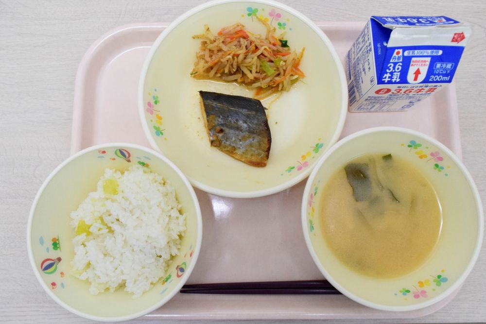 わかめごはん、和風ハンバーグ、ごぼうサラダ、みそ汁、牛乳 むぎいりごはん、黒はんぺんの揚げ煮、みそ汁、キウイ、牛乳