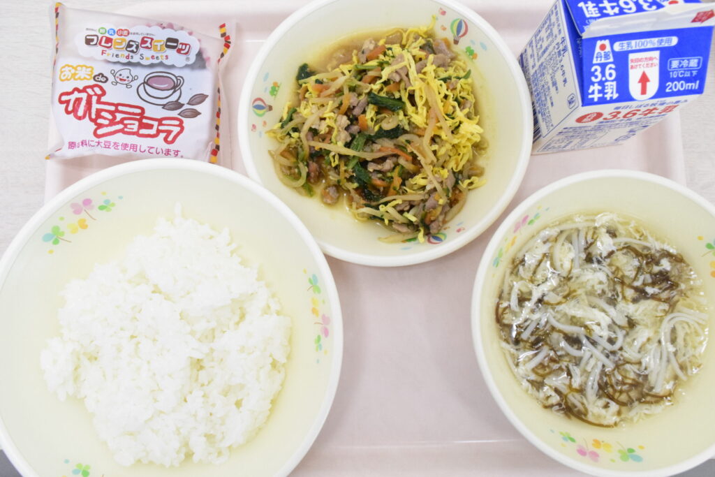 麦入りごはん、ビビンバ、もずくスープ、ガトーショコラ、牛乳