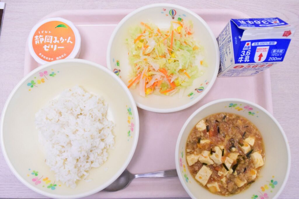 麦入りごはん、トマーボー、コールスローサラダ、静岡みかんゼリー、牛乳 -